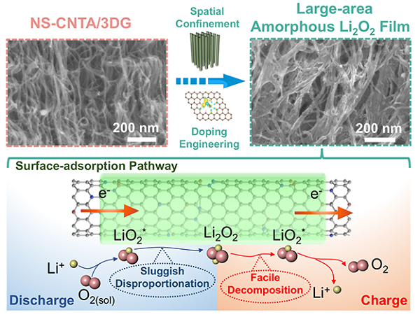 锂氧电池(LOB)由于其超高的理论能量密度(3623 Wh kg -1)、低成本、高效率和无毒,近年来在高性能储能设备领域受到了极大的关注。然而,循环稳定性差和LOB的大电压间隙掩盖了它们的商业可行性,这归因于Li2O2放电产物的大分解势垒。在非质子锂氧电池中,通过传统的表面或溶液途径形成的绝缘固体Li2O2很难同时实现高比容量和良好的可逆性。调整Li2O2的结构以在催化剂表面构建大面积非晶薄膜有望打破上述性能限制。