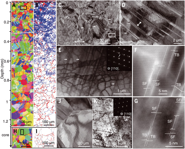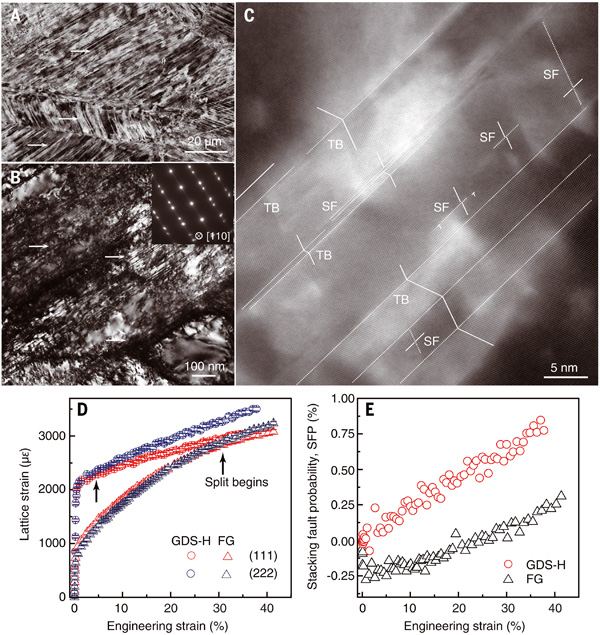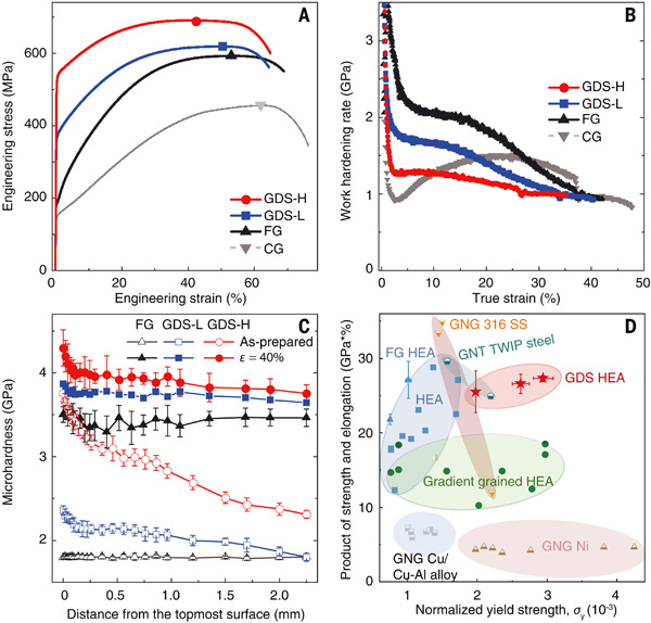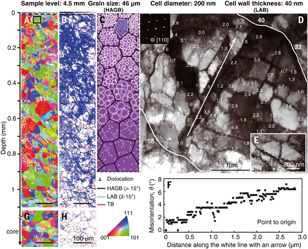 今日,在中国科学院金属研究所卢磊研究员团队等人带领下,在具有面心立方结构的稳定单相HEA中可控地引入了梯度纳米位错胞结构,从而在不明显丧失延展性的情况下提高了强度。在施加应变时,样品级的结构梯度诱导了高密度的微小堆垛层错(SFs)和孪晶的逐步形成,从大量的低角度位错胞成核。此外,SF诱导的塑性和由此产生的精细结构,加上密集积累的位错,有助于塑性、强度增加和加工硬化。这些发现为在纳米尺度上用梯度位错胞定制特性提供了一个有前景的范例,并促进了研究人员对HEAs内在变形行为的基本理解。相关成果以题为“Gradient cell–structured high-entropy alloy with exceptional strength and ductility”发表在了Science。