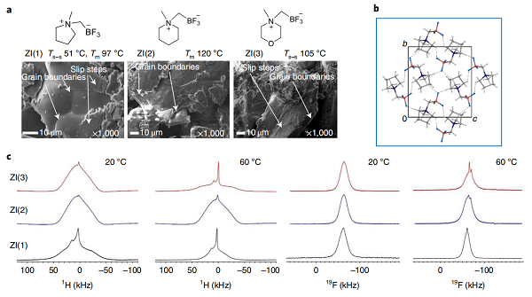 两性离子固体表现出不同的热行为取决于阳离子基团的结构。吡咯烷离子ZI (1) (图1)在51°C发生了明显的固-固相变,随后在97°C发生了熔融相变。固-固相变的存在很重要,因为它是可能导致塑性的分子无序的指标之一。固-固相变可以是晶体学改变和/或分子(或分子的部分)新的动力学模式的开始,从而给材料带来结构紊乱。即使在室温下,两性离子材料的形貌也显示出塑性,以滑移面和晶界的形式存在。在吗啉ZI(3)中,虽然用DSC没有检测到明显的相变,但在1H和19F核磁共振谱(图1c)中,宽峰顶上的一个窄峰即使在30°C也是可分辨的,这表明存在一定比例的阳离子和阴离子部分,其动力学随着温度的升高而增加。只有一小部分宽峰保留在100℃,刚好在120℃的熔点(Tm)之前。