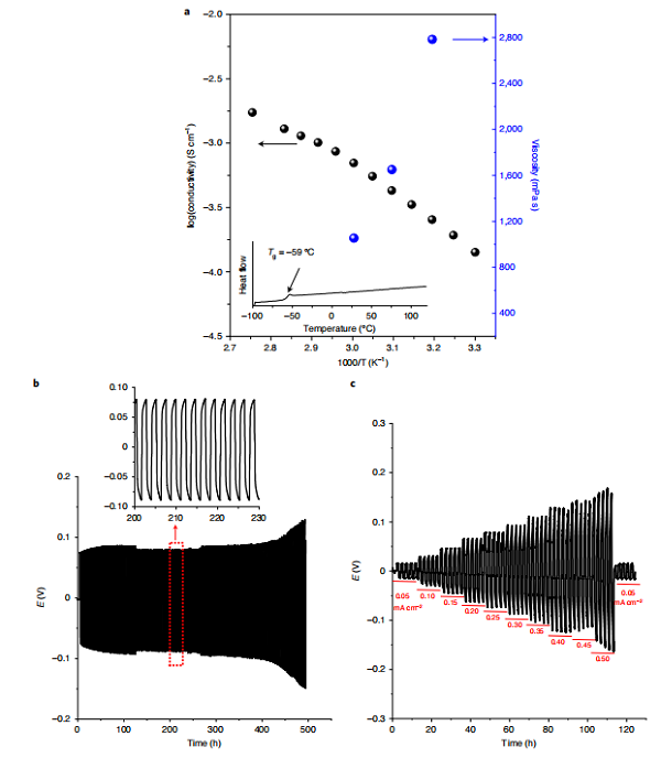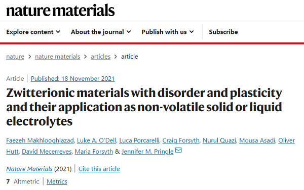 澳大利亚迪肯大学Jennifer M. Pringle课题组,报告了一系列表现出分子无序和可塑性的两性离子,这使得它们可以用作固体电解质。本工作使用差示扫描量热法、扫描电子显微镜、固态核磁共振和X射线晶体学等技术对这些材料的热学、形态和结构特性进行了表征。本工作报道了两性离子结合锂盐和锂功能化聚合物形成固体或高盐含量液体电解质的物理和输运性质,证明了两性离子基电解质可以允许高目标离子传输并支持稳定的锂金属电池循环。使用无序两性离子材料作为电解质进行高目标离子传导的能力,加上改变化学和物理性质的广泛范围,对未来非挥发性材料的设计具有重要意义,可在传统的分子和离子溶剂系统之间进行选择。相关论文以题为“Zwitterionic materials with disorder and plasticity and their application as non-volatile solid or liquid electrolytes”发表在 nature materials上。