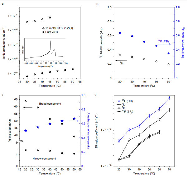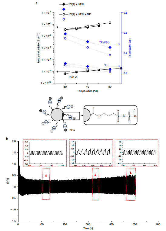 图4. 10 mol% LiFSI在ZI (1)及其与锂功能化聚合物纳米粒子混合物中的电导率、NMR和电池性能