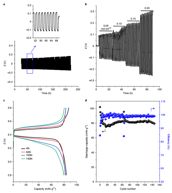 两性离子液体电解质同样对锂金属表现出良好的稳定性(图5b)。本工作在每个电流下施加一个小时的电流密度范围,可达0.5mAcm-2,共五个循环。锂的剥离和电镀即使在0.5 m Acm-2下也具有良好的稳定性和低极化电位。重要的是,当电流密度恢复到0.05mAcm-2时,低过电位恢复。这种稳定性在0.2 mAcm-2 (0.2mAhcm-2)的长期循环中也得到了保持。过电位保持在较低的水平,稳定在~80mV,在65个循环后仅仅降至~70mV。这归因于低的内阻,并且与导电SEI膜的形成一致。