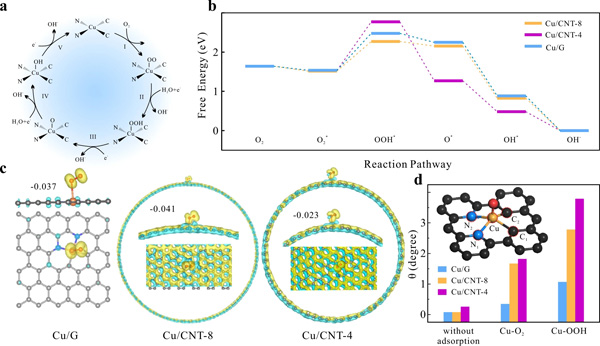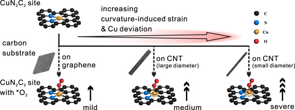 综上所述,团队以分散在不同sp2杂化碳基板上的单原子铜为模型,证明了单原子CuN2C2活性位点的几何畸变与ORR活性的关系。碳基板的几何变形与弯曲的扭转应变正相关,这是由于弯曲基底具有释放应变的热力学倾向。用合适的应变调整碳基底,可以在实现强Cu-O相互作用和保持与原来周围原子的大量Cu键之间达到一个微妙的平衡。这种平衡使得电荷最大化的从Cu原子转移到O2,从而极大地有利于ORR活性。该工作揭示了SACs在碳基底上的结构-功能关系,并为碳基底对嵌入单原子活性位点的活性表达机制提供了新的见解,这可能会扩展到其他催化体系。这一发现为进一步设计和促进SACs活性提供了新的途径。