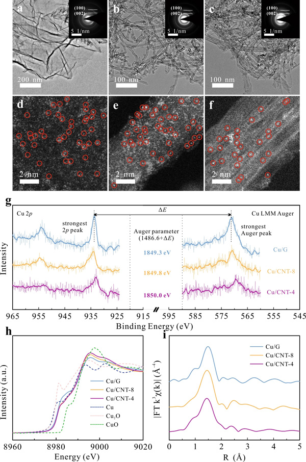 a-f)Cu/G (a, d)、Cu/CNT-8 (b, e) 和Cu/CNT-4 (c, f)的TEM图像a-c),插图为相应的SAED图案和(d-f)球差校正后的的HAADF-STEM图像(d-f)。