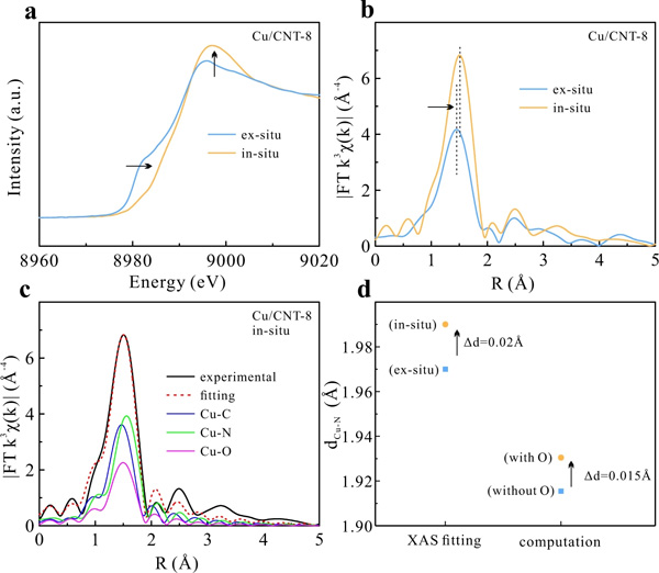 a,b)原位和非原位Cu K边 (a) XANES和(b) Cu/CNT-8的EXAFS。