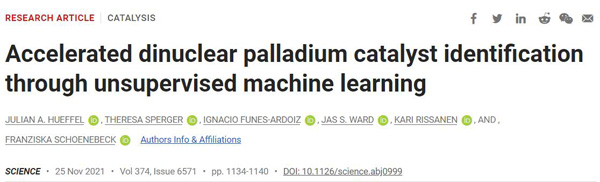 文献链接:Accelerated dinuclear palladium catalyst identification through unsupervised machine learning(Science,2021,DOI:10.1126/science.abj0999)