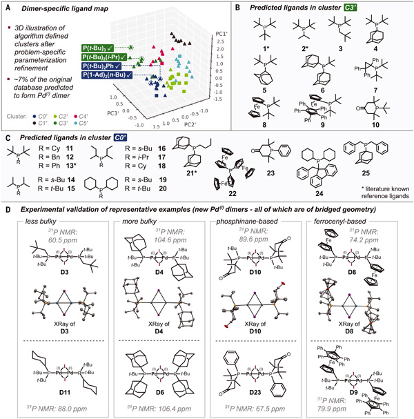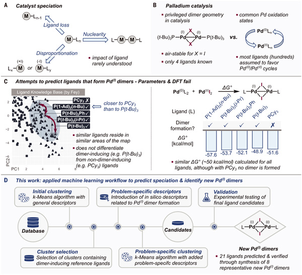 今日,在德国亚琛工业大学Franziska Schoenebeck团队等人带领下,报告了一个仅使用5个实验数据点的无监督机器学习工作流程。它利用了通用参数数据库,并辅以特定问题的计算机数据采集和聚类。团队展示了钯(Pd)催化剂形态形成的这一具有挑战性的问题,目前缺乏一个机理。从348个配体的总空间中,该算法预测并通过实验验证了许多膦配体(包括以前从未合成的配体),它们在更常见的Pd(0)和Pd(II)物种上产生双核Pd(I)配合物。相关成果以题为“Accelerated dinuclear palladium catalyst identification through unsupervised machine learning”发表在了Science。