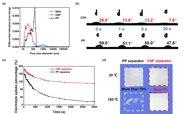 图3.隔膜的特性。(a)PP、NKK和CNF隔膜95/5的孔径分布。(b)电解液在隔膜表面的动态接触角。(c)电解液存储容量-时间曲线。(d)隔膜在20 °C和150 °C下保持30分钟后的数码照片。