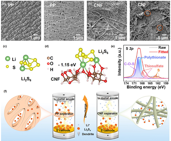 图6.隔膜对多硫化物的吸附效果。(a,b)隔膜循环前(左)和在锂硫电池中0.2C下循环300次后(右)的SEM图像。(c) Li2S6的优化结构。(d) Li2S6和CNF结合的模拟图。(e) CNF隔膜300次循环后的S 2p XPS光谱。(f)示意图:PP(左)和CNF(右)隔膜对锂硫电池中穿梭效应的影响。