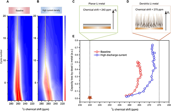 (C,D)不同锂金属形貌的7Li化学位移:平面锂金属和枝晶状锂金属;