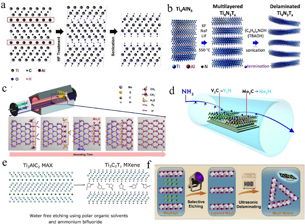 图 3. MXene制备方法介绍(a)湿法酸刻蚀,(b)熔融盐刻蚀,(c)过渡金属硫化物的渗碳,(d)过渡金属碳化物的氨化,(e)无水蚀刻,(f) 紫外线诱导蚀刻