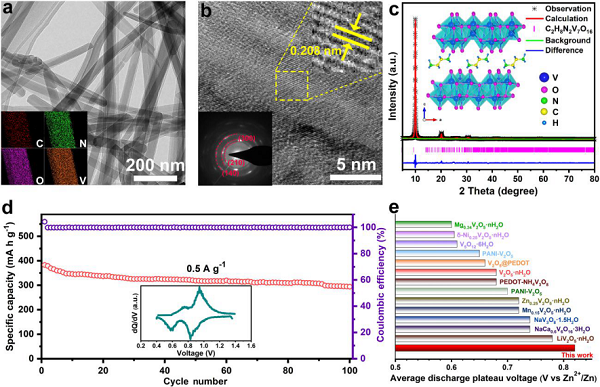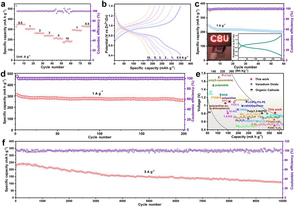 得益于氧化钒的高容量和乙二胺的高工作电压,该杂化正极不仅提供了0.82V的高工作电压,而且还实现了高容量和长循环寿命等优异的电化学性能。