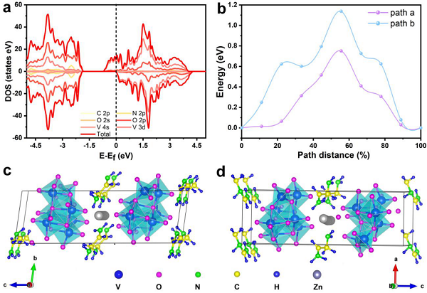 此外,为了研究乙二胺掺杂对EDA-VO电子结构的影响,密度泛函理论(DFT)计算揭示了其电子性质。EDA-VO作为正极材料,电池的高工作电压和容量源于其独特的电子结构和双重储锌机制。