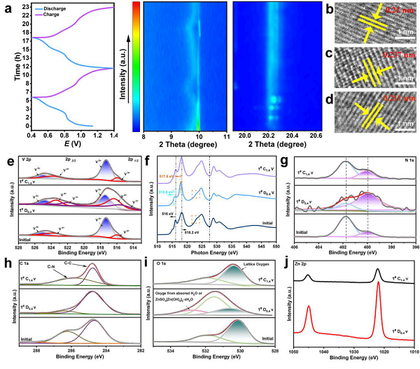 为了进一步阐明EDA-VO的Zn2+储存机制,进行了原位X射线衍射,以研究前两圈在充电-放电循环中的结构演变。通过同步辐射表征分析EDA-VO正极中元素电子状态在充放电过程中的演化行为。