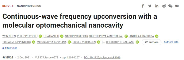 文献链接:Continuous-wave frequency upconversion with a molecular optomechanical nanocavity(Science,2021,DOI:10.1126/science.abk3106)