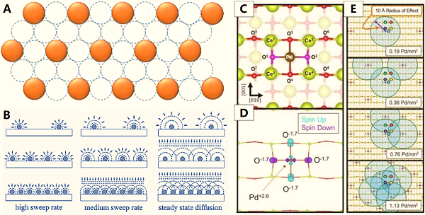 对于纳米颗粒体系,高金属密度电催化剂可以在广泛的电化学过程中产生独特的离子扩散特性。从不同电位扫描速率下纳米颗粒阵列的表面密度相关扩散模型(见图2 B)可以看出,在高扫描速率下,扩散层厚度远小于相邻粒子之间的平均距离,在中等扫描速率下,相邻粒子的扩散层重叠以获得高粒子密度,而在极低扫描速率下,不同密度均达到稳态扩散。这些电化学特性对高密度纳米结构电催化剂的设计具有积极的指导意义,相邻粒子扩散层重叠效应可能会对高密度结构产生意想不到的电催化协同效应。