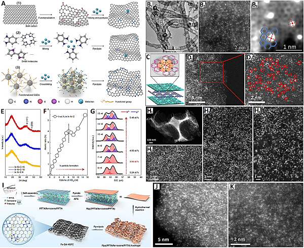 在众多的过渡金属SACs中,Fe-N-C催化剂的ORR性能最为突出。Fe-N-C催化剂主要通过热解含有Fe、N和C的前驱体来制备,其中C和N前驱体转化为N掺杂的碳骨架,Fe原子与N原子配位以获得FeN4活性中心。通过直接热解获得的掺氮碳骨架含有许多无序微孔,由于微孔中的传质动力学较低,导致FeN4活性中心的利用率较低。此外,催化剂的活性取决于单个金属位点的固有活性和可接近活性位点的数量。因此,提高Fe-N-C催化剂的金属负载量(高密度)和FeN4活性中心的可及性(如设计介孔)是进一步提高Fe-N-C催化剂ORR性能的有效途径(见图6A-F)。