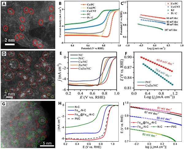 Fig. 3 高密度金属合金ORR电催化剂:(A~C) rGO支撑FePt; (A~C) 3-D MGS支撑PtAg合金。