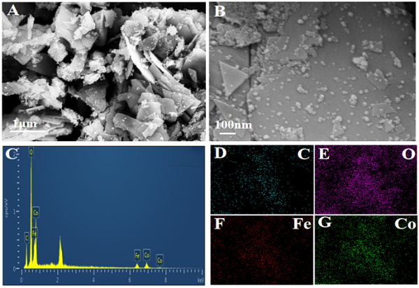 图1 (A-B)低倍率和高倍率下FeCoO/GO的微观形貌;(C-G) FeCoO/GO的EDS和元素映射图