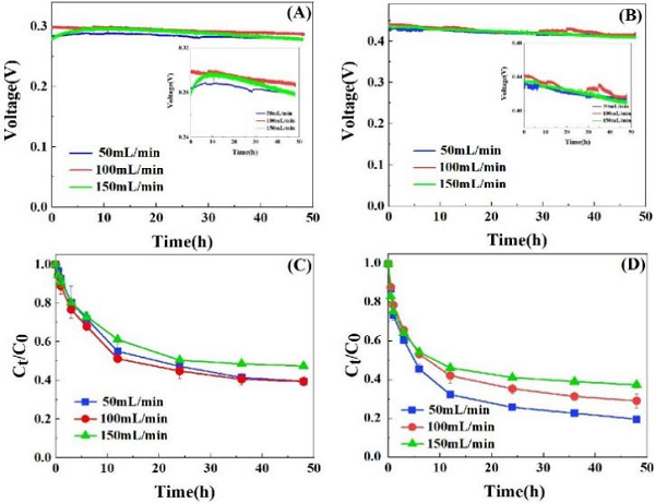 图3 (A-B)CF阴极和FeCoO/GO阴极在电解液中含有20 mg/L OTC时,不同曝气量下的输出电压;(C-D)CF阴极和FeCoO/GO阴极在不同曝气量下对20 mg/LOTC的降解效率
