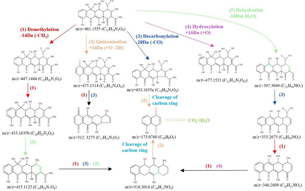 UPLC-QTOF-MS证实,甲基、羟基和羰基逐渐被·OH破坏并从OTC分子中分离出来。降解主要是由于空气阴极中ORR和Fenton反应产生的·OH的氧化作用。根据基团贡献理论,苯环上的位点会被·OH攻击而发生甲基化和羟基化。脱水反应形成不饱和碳碳双键。最终,中间体被转移到小分子中,实现矿化。