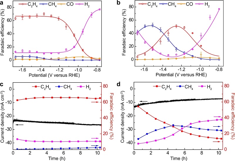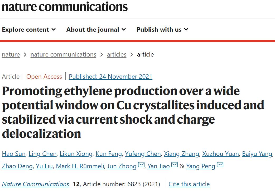 文献链接:Promoting ethylene production over a wide potential window on Cu crystallites induced and stabilized via current shock and charge delocalization. Nature Communications, 2021, DOI: 10.1038/s41467-021-26480-9.