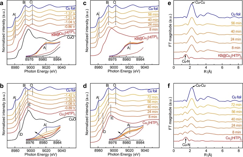 (c-d)KB@Cu3(HITP)2和Cu3(HITP)2在-1.25 V下作为反应时间的函数的Operando Cu K-edge XAS;
