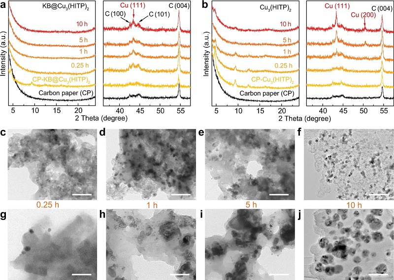 (g-j)Cu3(HITP)2在-1.25 V下经过0.25、1、5和10 h计时电流测试后拍摄的TEM图像。