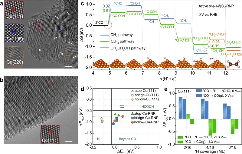 (d)Cu-RNP和Cu(111)表面不同位点的ΔE*CO和ΔE*H之间的关系;