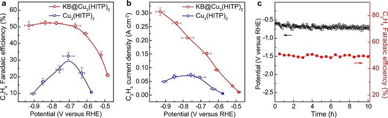 (a-b)使用1 M KOH电解质的KB@Cu3(HITP)2和Cu3(HITP)2,在不同电位下的流动池中测试FEs和C2H4的局部电流密度;