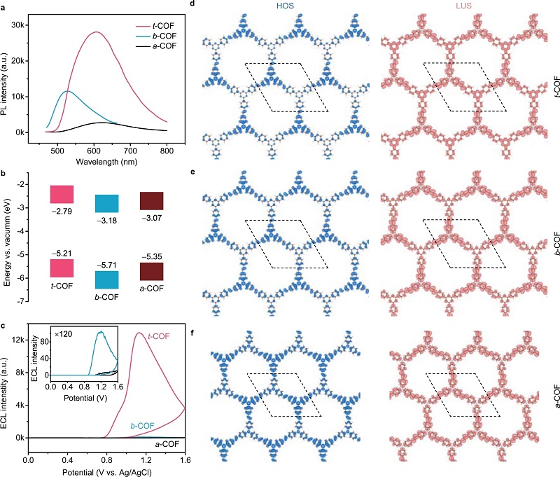 (d-f)顶视图中t-COF、b-COF和a-COF的HOS和LUS。