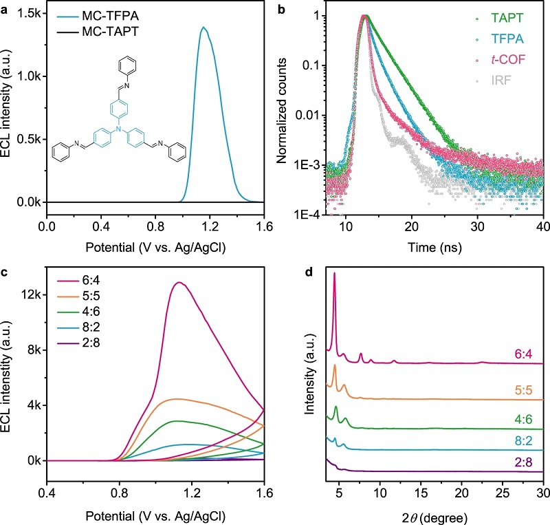 (c-d)ECL对结晶度的依赖性和对应的t-COFs的PXRD光谱。