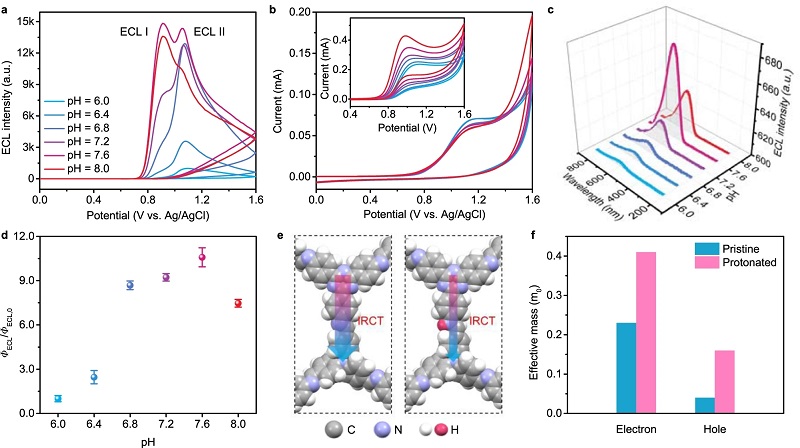 近日,南京大学雷建平教授和袭锴教授、中国科学技术大学武晓君教授(共同通讯作者)等人报道了一种具有三苯胺和三嗪单元的供体-受体(D-A)共价有机框架(COF),作为具有可调节网内电荷转移(IRCT)的高效ECL发射体。与具有小D-A对比度的苯基COF相比,D-A COF的ECL强度增强了123倍。此外,COF的结晶度和质子化调控ECL行为证实了ECL依赖于供体和受体单元之间的网状内电荷转移,这一点由密度泛函理论(DFT)计算的证实。值得注意的是,COFs的双峰ECL模式是通过IRCT介导的竞争性氧化机制实现的:辅助反应剂介导的低电位氧化和高电位直接氧化。总之,该工作为下一代ECL器件的设计提供了提高ECL效率的新的基础和途径。研究成果以题为“Intrareticular charge transfer regulated electrochemiluminescence of donor-acceptor covalent organic frameworks”发布在国际著名期刊Nature Communications上。