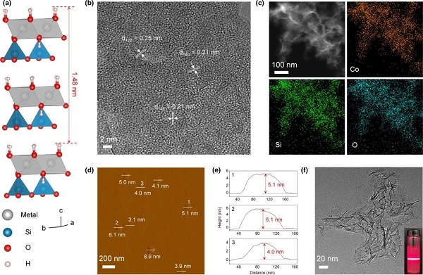 图1. a)层状硅酸盐的晶体结构图;b)硅酸钴的高分辨TEM图;c)硅酸钴的EDX mapping图;d-e)硅酸钴的AFM图;f)硅酸钴的TEM图和丁达尔效应光学照片。