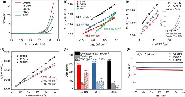 图2. 三种硅酸盐的OER性能。a)LSV曲线;b)Tafel斜率;c)比表面积较正后的活性图以及TOF;d)ECSA分析;e)过电势、Tafel斜率以及TOF比较;f)稳定性。