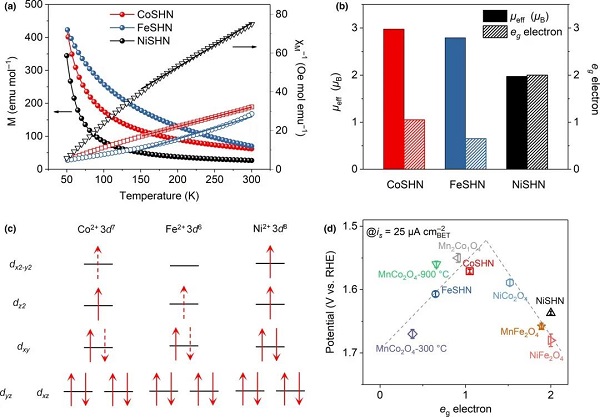 图3. a)变温磁化率图;b)从变温磁化率计算所得的有效磁矩和eg轨道电子数;c)Co2+、Fe2+、Ni2+的分子轨道电子占位示意图;d)三种硅酸盐与一系列尖晶石型氧化物的eg轨道电子数和OER活性的关系。