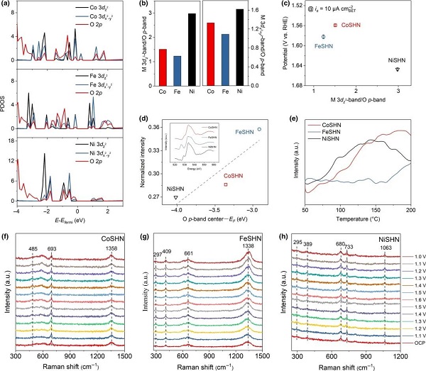 图4. a)金属3dz2-band、M 3dx2-y2-band和O p-band的PDOS图;b)三种硅酸盐的[3dz2]/[2p]和[3dx2-y2/2p] 比例;c)在10 μA cm−2处的ir校正电势与硅酸盐的[3dz2]/[2p]比例关系图;d)O-K边XAS图以及prepeak的归一化强度与O p带中心到费米能级距离的关系图;e)O2-TPD图;f-h)原位拉曼图。