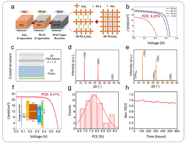 图9 a)用于形成2D PEA2SnI4和3D MASnI3钙钛矿双层结构的连续蒸气过程示意图。b)不同PEAI沉积厚度的钝化PSC的J-V曲线。c)准2D/3D异质结构薄膜(锡基)的形成示意图。d)和e)分别为引入和不引入SCN的PEA2SnI4的XRD图谱。小的衍射角意味着在加工过程中引入SCN后形成了二维结构。f)相应准2D/3D异质结构PSCs的J-V曲线;插入图像是一个示意图,说明能量水平。g)基于准2D/3D异质结构PSCs的效率直方图。h)储存在N2气氛手套箱中的2D/3D异质结构PSC的标准化PCE