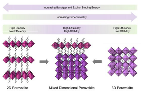 图1. 2D钙钛矿、3D钙钛矿和2D/3D混合维钙钛矿在光电性质和稳定性方面的示意图