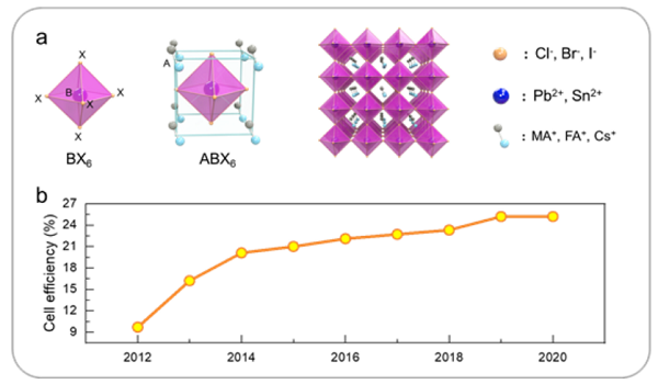 图2 a)传统3D钙钛矿晶体结构示意图和b)基于3D PSCs的PCE相应演化