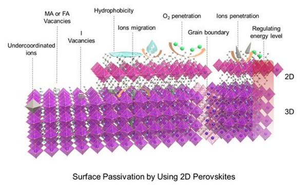 表面钝化形成的2D/3D异质结:2D钙钛矿作为3D钙钛矿薄膜的表面钝化剂,在化学上结合形成异质结构,具有以下优点:(1) 修复表面MA/FA/I空位缺陷,提高薄膜质量。(2) 间隔有机层阻挡离子迁移和水分侵蚀,同时兼备较大的形成能,从而提升材料的稳定性。(3) 由2D/3D钙钛矿堆叠形成的异质结构有效地促进电荷转移/提取,以提高器件的光伏性能