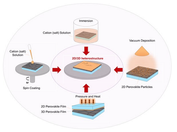 图4 示意图说明2D/3D异质结构制造过程,包括溶液旋涂、浸没、真空沉积和压力/热下的固体生长