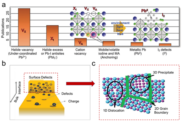 图5 a)钙钛矿缺陷类型。b)三维钙钛矿薄膜表面和体缺陷图,其中缺陷主要发生在表面。c)晶体结构中存在不同尺寸的缺陷