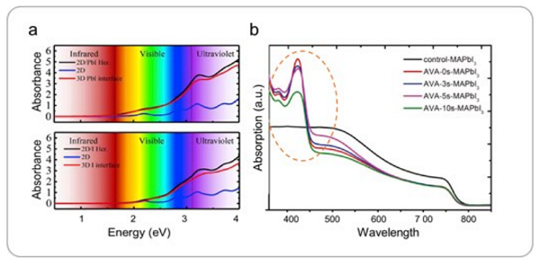 图6 a)二维BA2PbI4钙钛矿、三维PbI基钙钛矿和2D/3D异质结构钙钛矿的吸收光谱