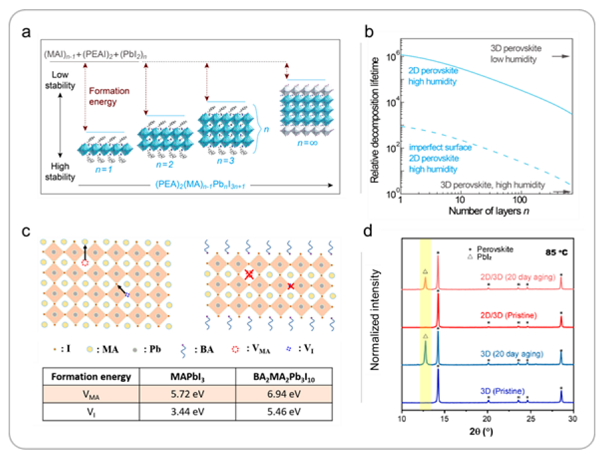 图7 a)和b)用DFT模拟计算了不同n值的PEA2MAn‑1PbnI3n+1钙钛矿的形成能,显示了稳定性从2D (n=1)到3D(n=∞)的演化。c)计算了3D和2D钙钛矿中离子迁移的空位路径图,以及3D和2D钙钛矿中空位缺陷的形成能。d)XRD图谱对应于样品在氮气中85℃老化进行热稳定性测试
