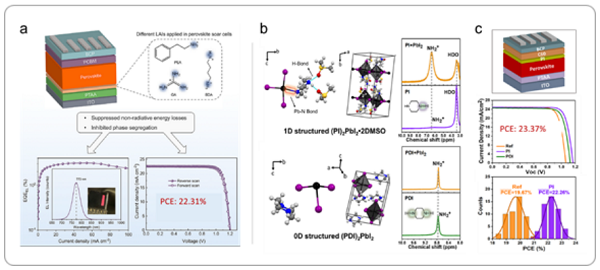 图8 a)通过在钙钛矿层与空穴传输层之间引入大的烷基铵夹层(LAIs),同时抑制钙钛矿层顶界面和底界面的非辐射能量损失。b) (PI) 2PbI2·2DMSO和(PDI) 2PbI2的晶体结构。c)钝化PSCs (和控制PSCs)的器件结构及相应的光伏性能
