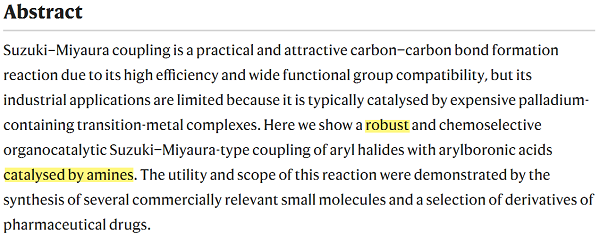 Suzuki-Miyaura反应是一个很经典的有机化学偶联反应,其发现者Akira Suzuki是2010年诺贝尔化学奖得主。这个反应原本是采用金属钯的配合物进行催化,从而实现C-C键的偶联,但昂贵的金属的存在势必导致产物中可能的金属杂质,以及较高的成本,因此,尽管这一反应用途广泛,但这一关键短板尚未得到解决。因此,上述论文采用了无金属的胺来催化反应,那么,显然的优势就体现出来了:金属的弊端没有了!并且在论文中还实现了克级的产物制备,这样的惊艳结果发表在Nature系列期刊是足够的。