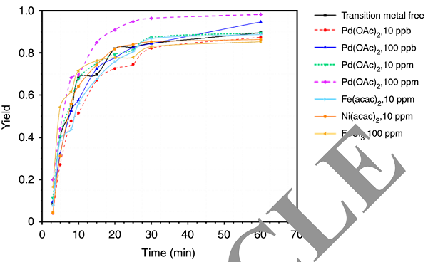 Moreover, to exclude any major effect from residual traces of the transition-metal species, we studied the reaction kinetics in the presence/absence of additional metal species. After adding 10 ppb−10 ppm Pd, 100 ppm Fe and 10 ppm Ni, the reaction rate did not change significantly.