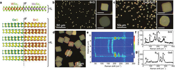 a)单层MoSe2和WSe2之间的横向异质结构(顶部)和多层横向异质结构(底部),其中许多范德瓦尔斯层中的每一层都包含一个界面,这里是正交GeS和SnS之间的界面。