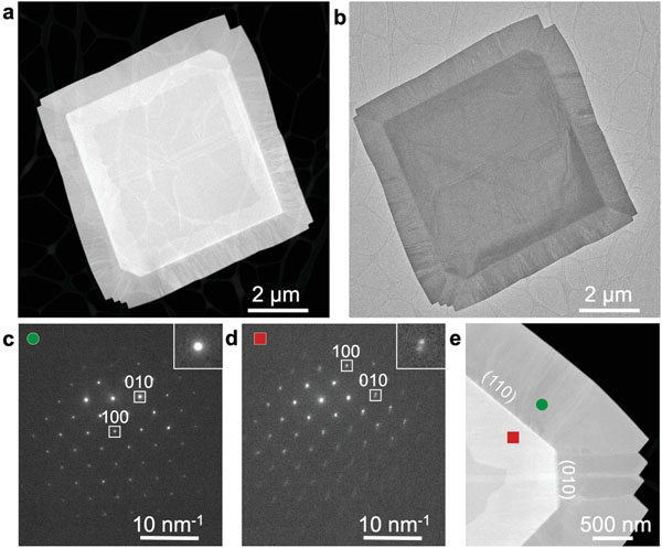 c)b所示的样品光学图像,在GeS前体420℃温度下,GeS生长,形成GeS-SnS异质结构。放大图像显示了厚{110}多面异质结构的SnS核心和GeS边缘之间的特征光学对比度。